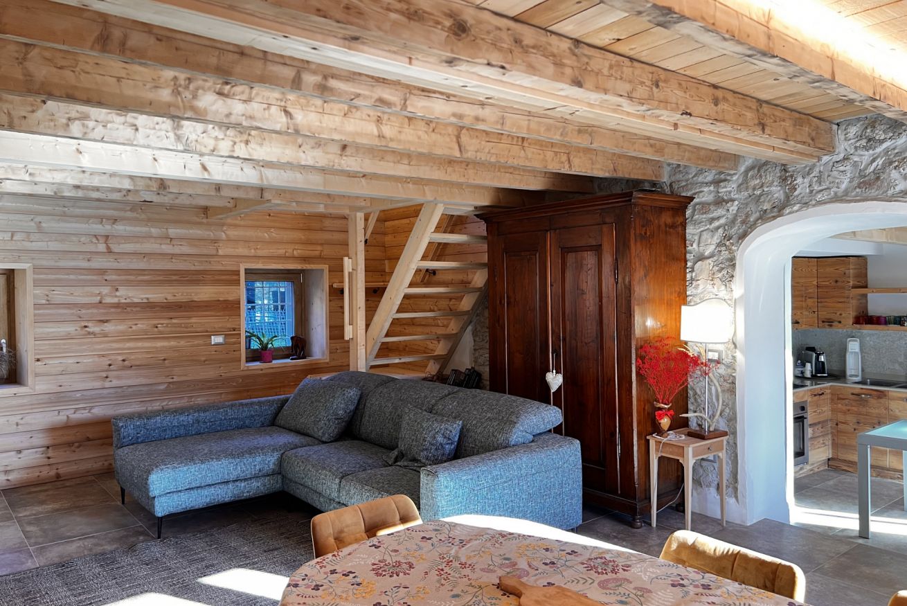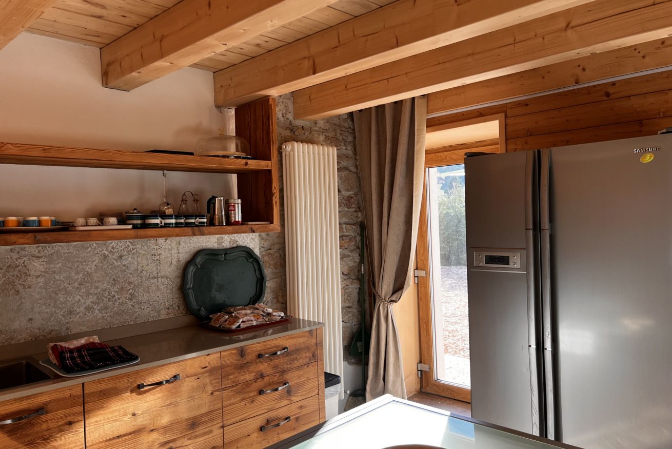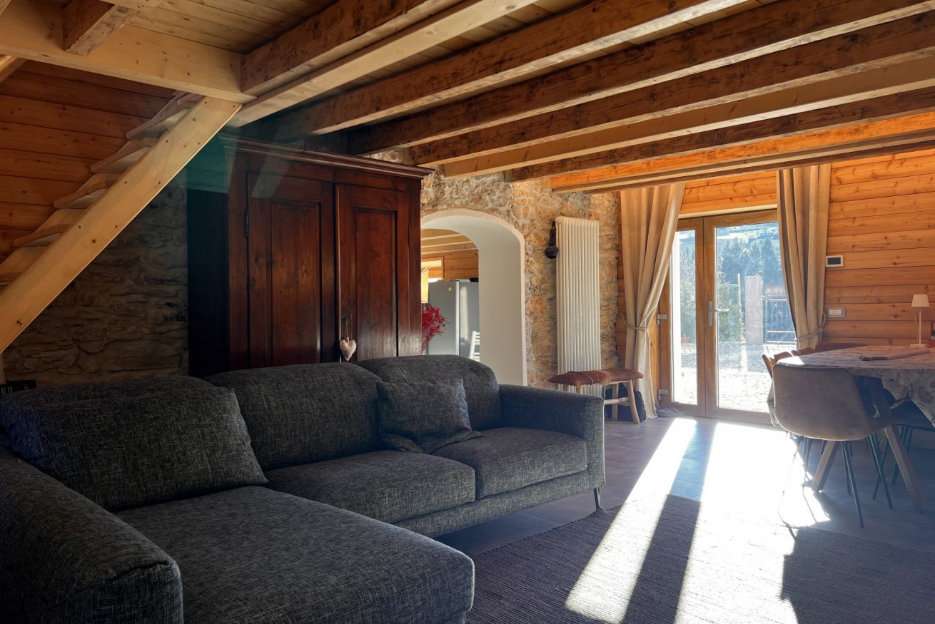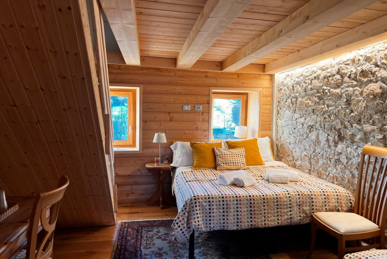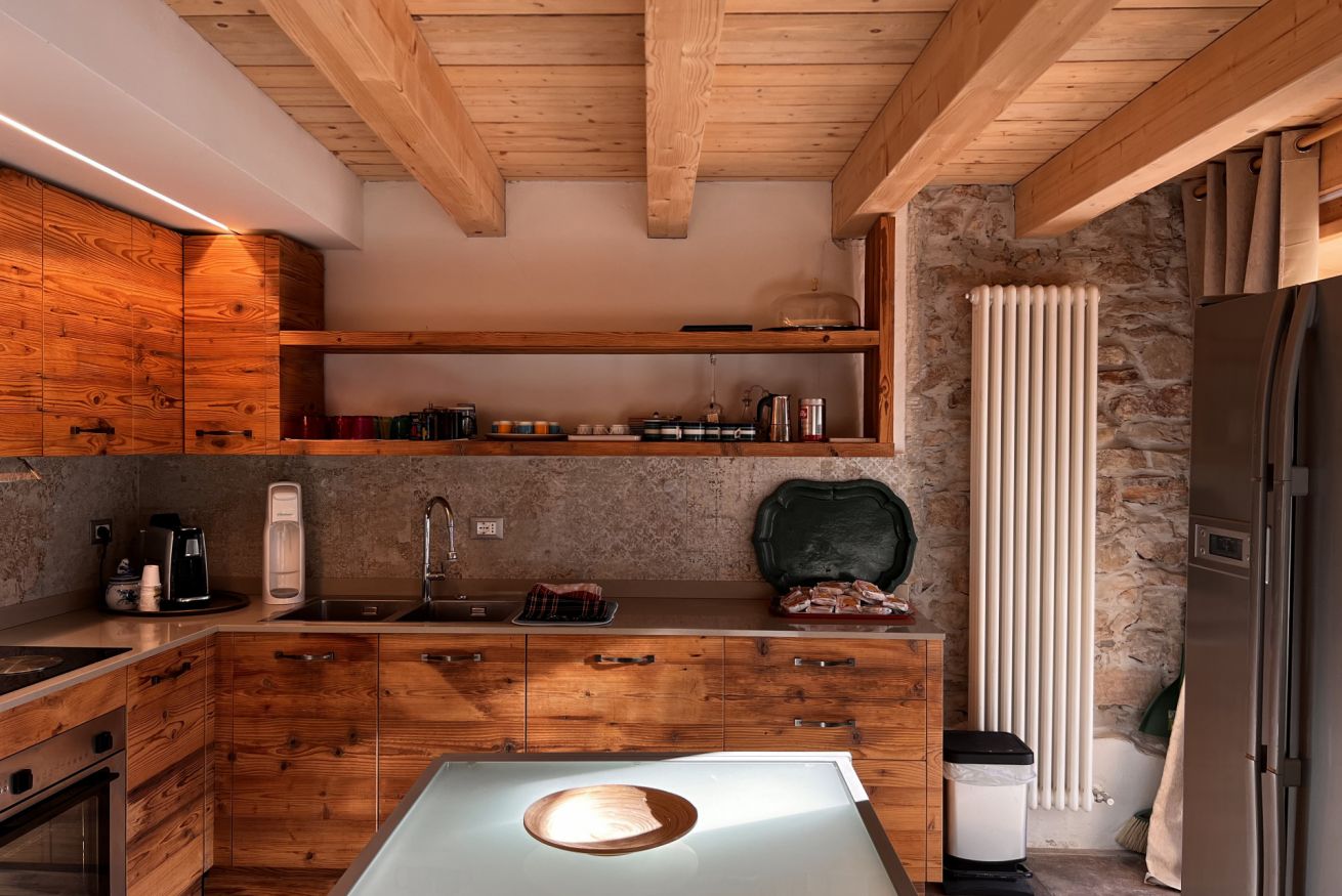 Entrando, sarete accolti da un ampio soggiorno caratterizzato da travi in legno e un caminetto scoppiettante, perfetto per le serate invernali. L’ambiente è luminoso e arredato in stile rustico, con divani comodi, una Smart TV e un tavolo da pranzo in legno con sedie eleganti, ideale per momenti conviviali o per sorseggiare un caffè ammirando la vista panoramica.