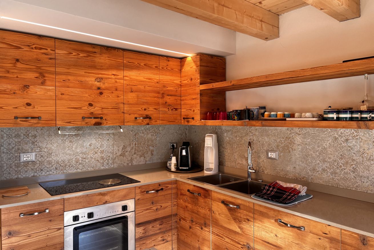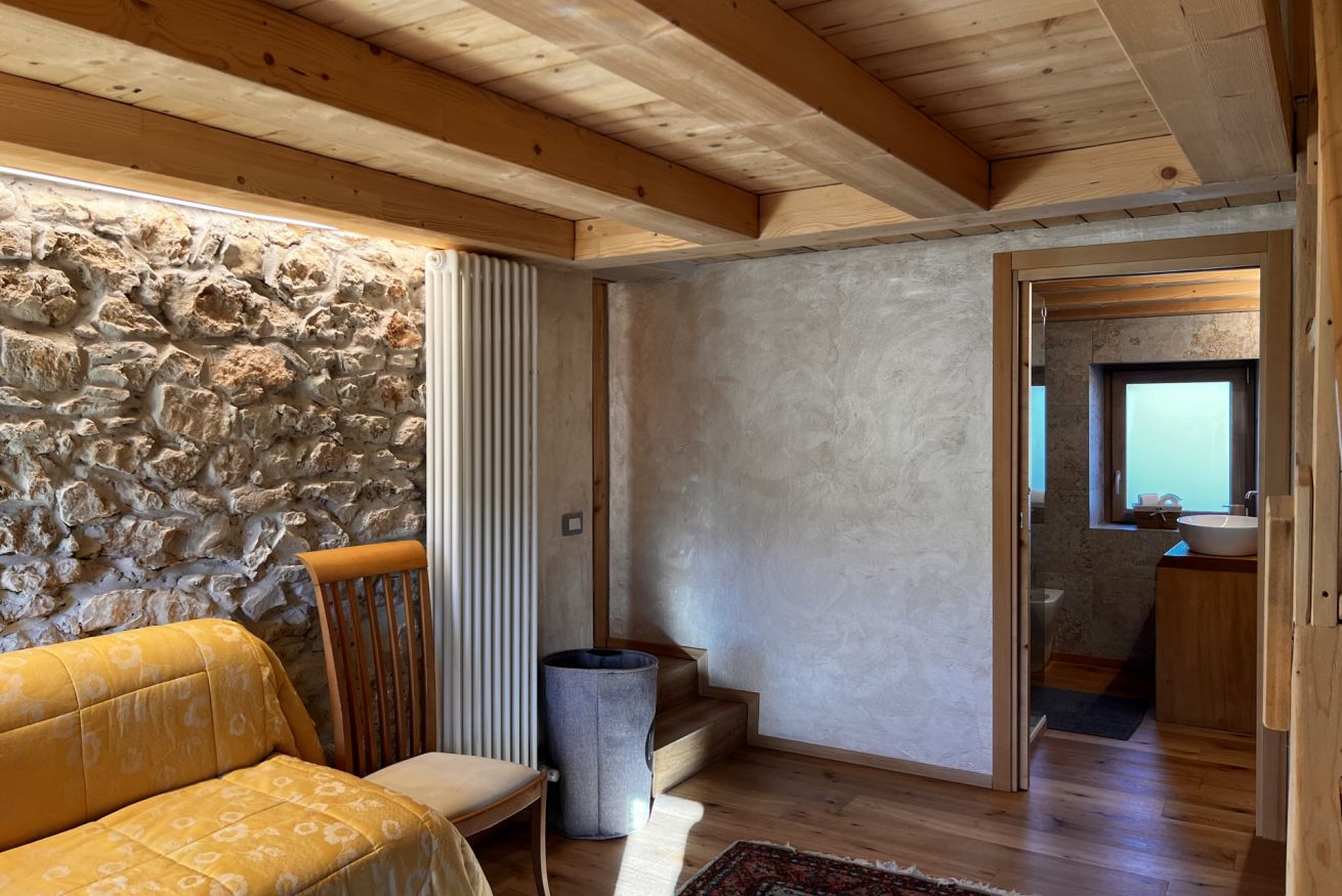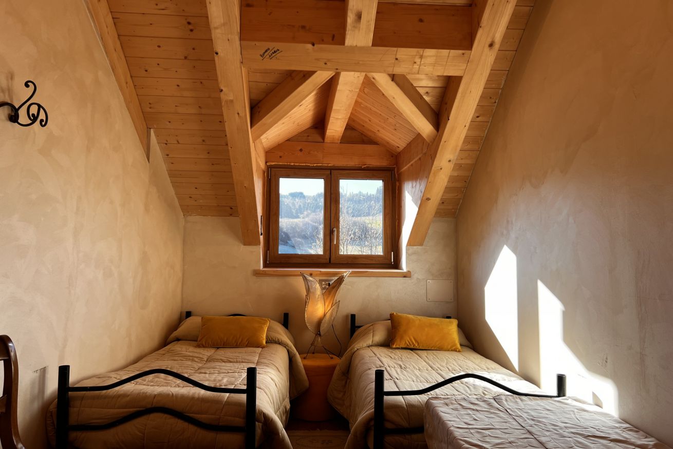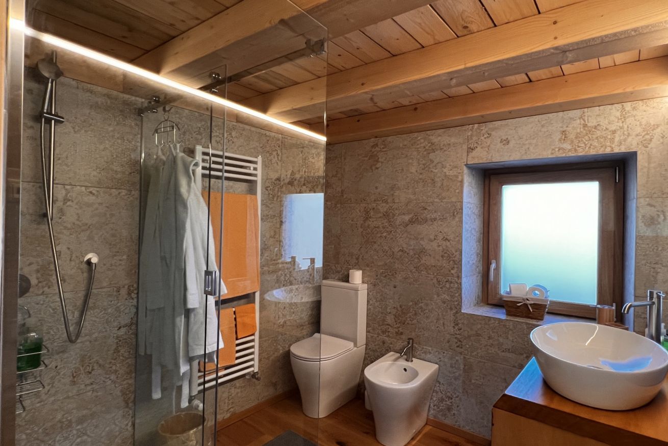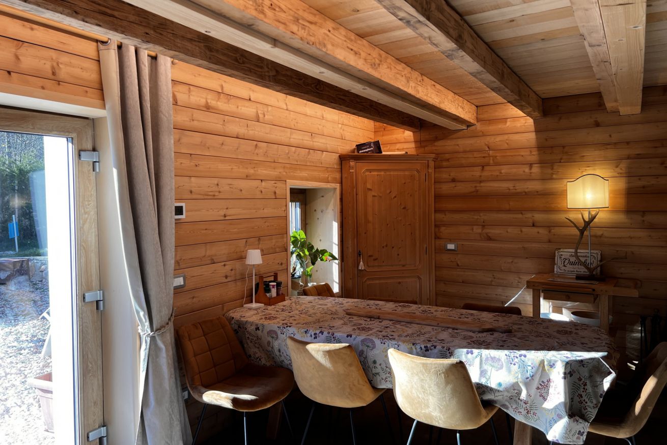 Entrando, sarete accolti da un ampio soggiorno caratterizzato da travi in legno e un caminetto scoppiettante, perfetto per le serate invernali. L’ambiente è luminoso e arredato in stile rustico, con divani comodi, una Smart TV e un tavolo da pranzo in legno con sedie eleganti, ideale per momenti conviviali o per sorseggiare un caffè ammirando la vista panoramica.