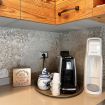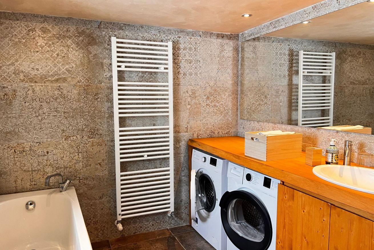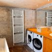 La cucina è completamente attrezzata, con piano cottura, forno, frigorifero e tutti gli utensili necessari per cucinare con comodità. È presente un piccolo tavolo per colazioni o pasti veloci, così da lasciare ampio spazio per muoversi liberamente mentre si prepara il cibo. Dalla cucina si accede a un bagno completo con vasca, dotato di lavatrice e asciugatrice, per la massima praticità durante il soggiorno.
